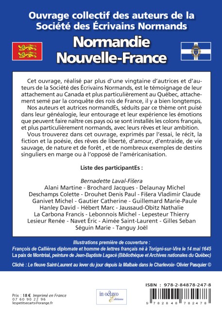 de France, il y a bien longtemps. Les liens établis par les marins, les colons, les coureurs des bois et les missionnaires issus de nos contrées normandes, ont perduré dans les consciences, et se sont renouvelés grâce à des facteurs historiques, religieux et culturels que nos écrivainEs n’ont demandé qu’à exploiter. Vous trouverez ici, exprimés par l’essai, le récit, la fiction et la poésie, des rêves de liberté, d’amour, d’entraide, de vie sauvage, de nature et de forêt, et de nombreux exemples de destins singuliers en marge de l’américanisation.